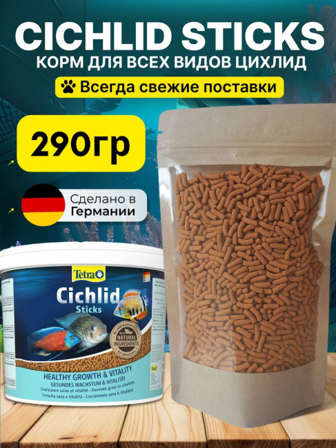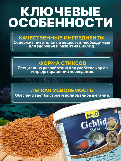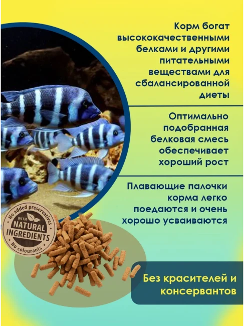 ОписаниеTetra Cichlid Sticks — высококачественный корм в виде палочек для всех видов цихлид.Идеально подходит для ежедневного кормления цихлид и других крупных декоративных рыб в аквариуме. Оригинальная форма кормовых палочек гарантирует поедание корма. Палочки плавают на поверхности воды в аквариуме, благодаря своей форме принимают вид естественного природного корма для крупных рыб в аквариуме. Полностью натуральный состав, содержит полный комплекс протеинов, витаминов и специальных аминокислот. Корм для рыбок Tetra Cichlid Sticks гарантирует усиление натуральной окраски, сопротивляемость к болезням и жизненную энергию рыб.Корм очень хорошо усваивается, благодаря технологии производства фирмы Tetra. Немного повышенный уровень содержания углеводов делает этот корм ценным питанием для этих великолепно окрашенных рыб. Высокие питательные свойства корма гарантируют правильное развитие рыб и хорошую размножаемость. В состав корма входит стабилизированный витамин C, который обеспечивает здоровый рост рыб и укрепление их иммунитета.Высококачественный корм в виде палочек для всех видов цихлид.Подходит для ежедневного кормления цихлид и других крупных декоративных рыб.Плавает на поверхности воды, гарантирует поедание.Полностью натуральный состав.Содержит полный комплекс протеинов, витаминов и специальных аминокислот.Гарантирует усиление натуральной окраски, сопротивляемость к болезням и жизненную энергию рыб.Высокое качество.Объем1 литрДополнительное фотоУ этого товара нет ни одного отзыва. Вы можете стать первым.